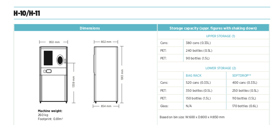 The H-11 Dual Cabinet es una máquina independiente que integra un sistema de clasificación y compactación de envases individuales vacíos de bebidas no rellenables. Es un sistema con una capacidad de almacenaje ideal para aquellas tiendas que reciben volúmenes de medios a altos de envases, minimizando así la necesidad de vaciar con frecuencia las cubas de almacenaje y asegurando una mayor eficiencia.